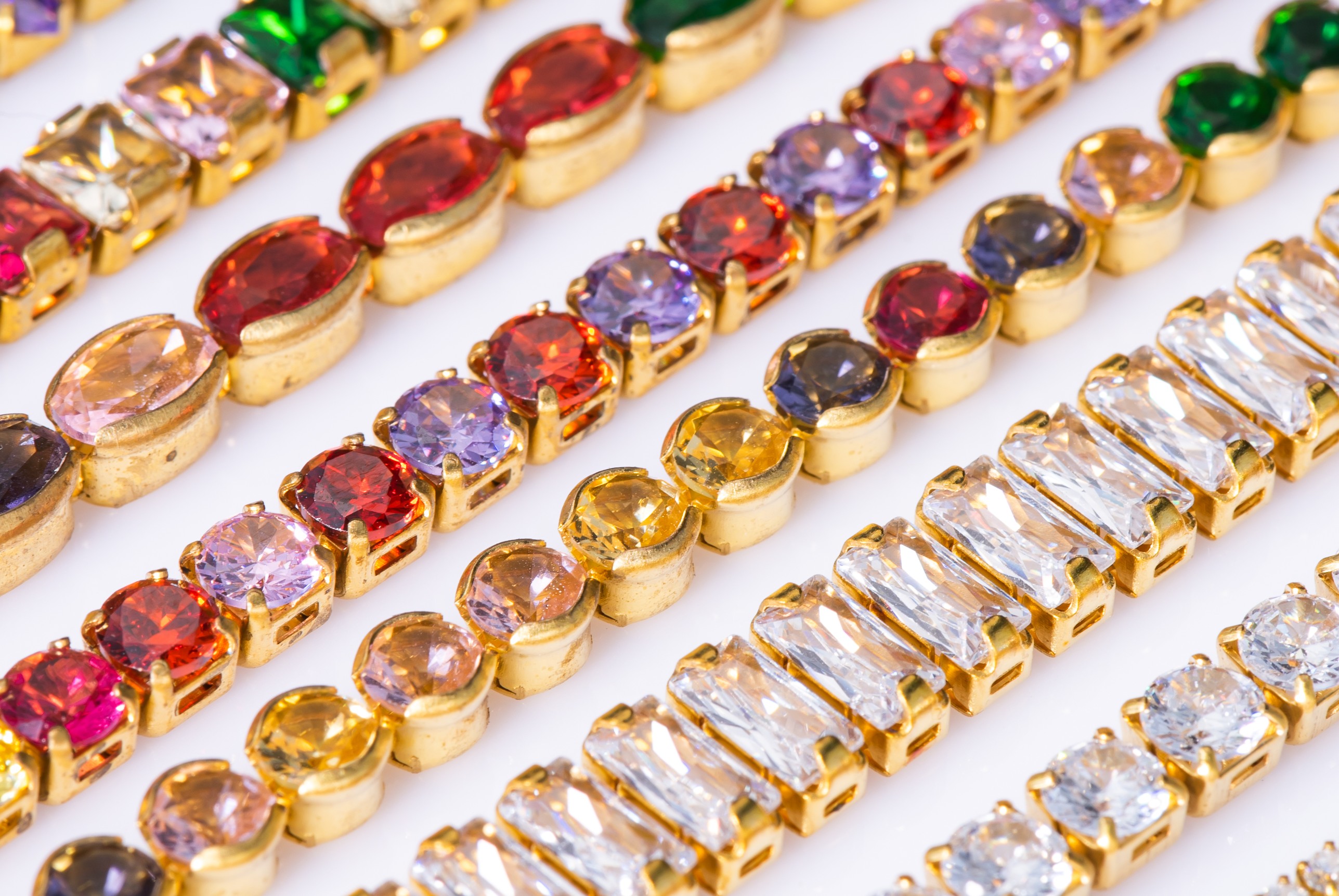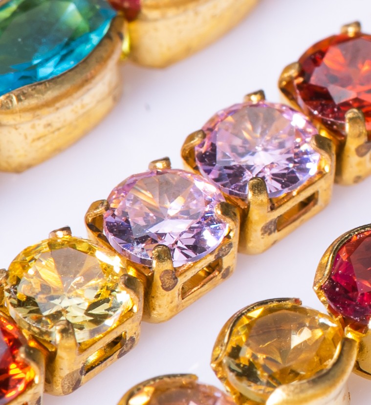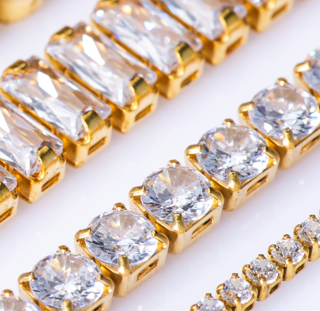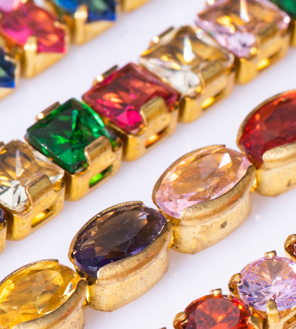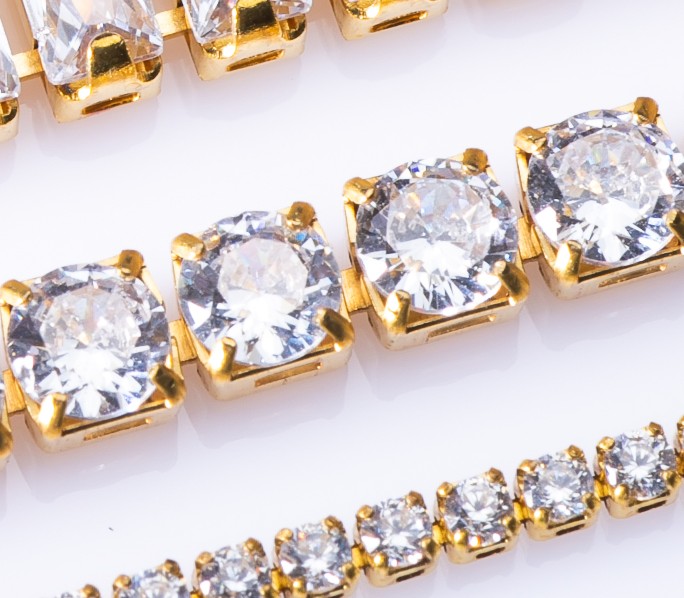Riviera são correntes de latão com zircônias cravadas de diversos formatos, tamanhos e cores. São muito utilizadas na fabricação de pulseiras e outras semi joias.